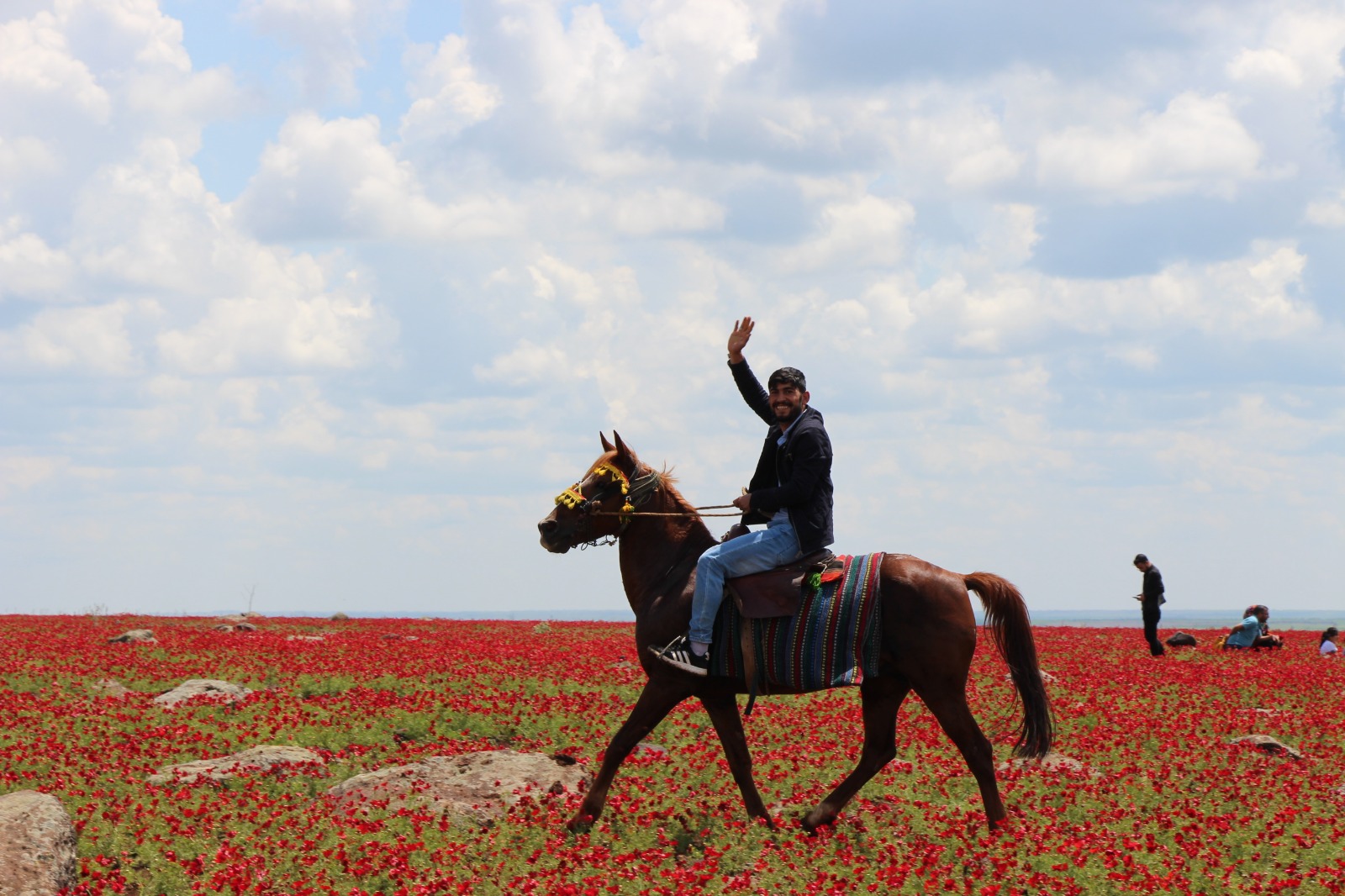 İlçeye yakın araziler ile kırsal mahallerdeki binlerce dönüm arazide kırmızı çiçek açan gelinciklerin bulunduğu yere gelen vatandaşlar, o anı ölümsüzleştirmek için fotoğraf çekerken çocuklar ise gelincikler içinde oyun oynadı.