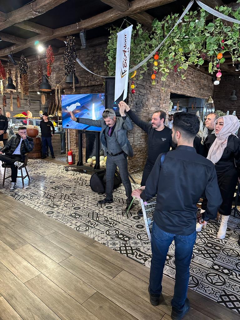 Firmanın Yönetim Kurulu Başkanı iş kadını Türkan Gürler, Satış Müdürü Metin Yiğit ve Finans Müdürü Oya Topalel’in de katıldığı kutlama, 75 Metre Yol üzerinde bulunan Hancı Lokantası’nda gerçekleşti. Mahalli sanatçı Natık Uncu ve saz ekibi eşliğinde halay çeken BiAdoor personelleri, gönüllerince eğlendi. Türkan Gürler ve Finans Müdürü Oya Topalel’in karşılıklı oynaması izleyenler tarafından büyük alkış aldı.