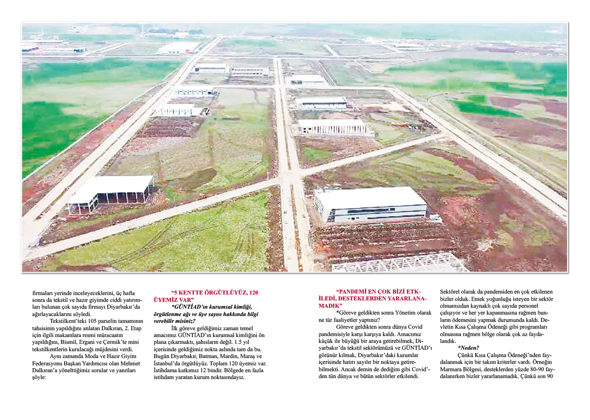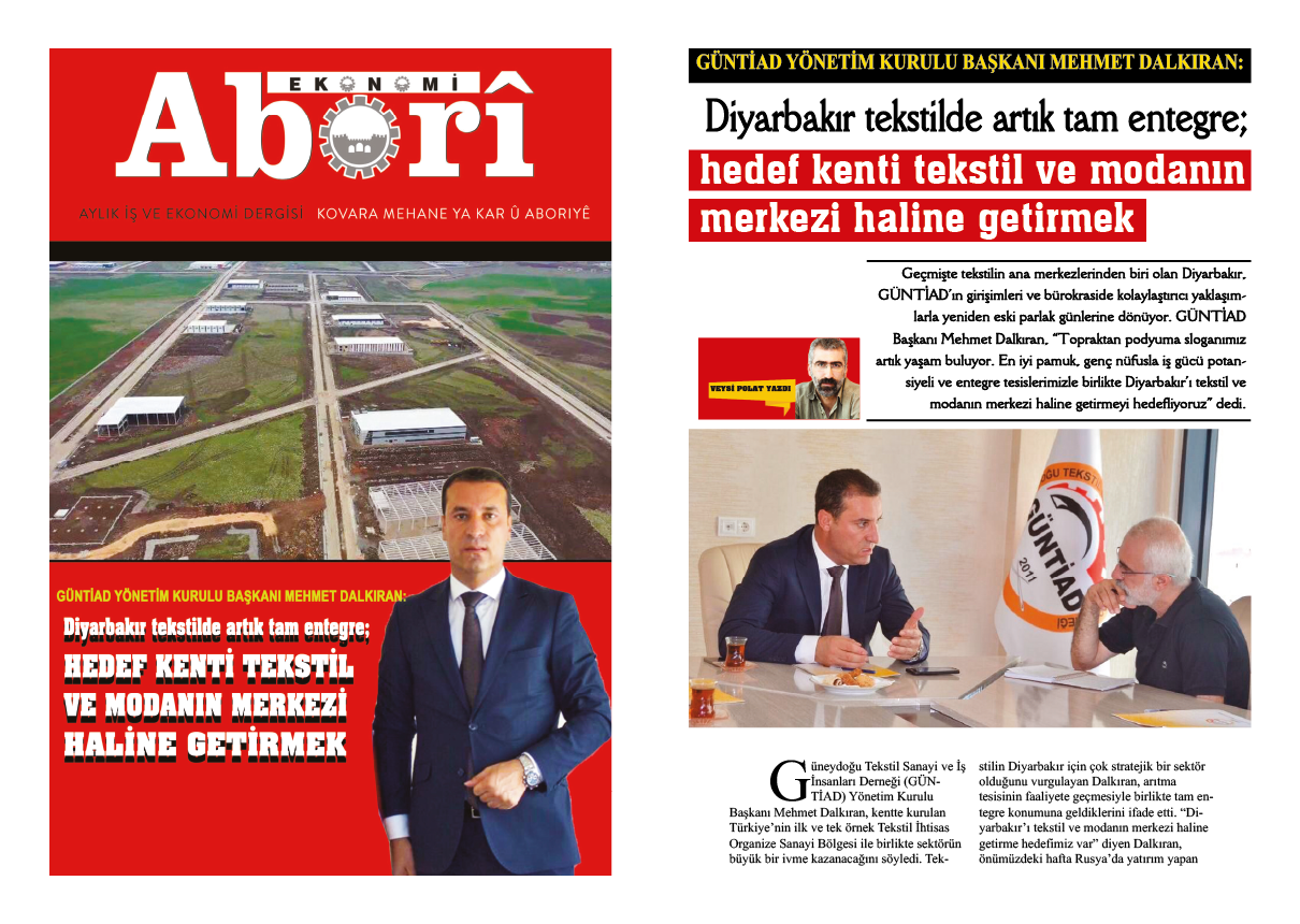 Güneydoğu Tekstil Sanayi ve İş İnsanları Derneği (GÜNTİAD) Yönetim Kurulu Başkanı Mehmet Dalkıran, kentte kurulan Türkiye’nin ilk ve tek örnek Tekstil İhtisas Organize Sanayi Bölgesi ile birlikte sektörün büyük bir ivme kazanacağını söyledi. Tekstilin Diyarbakır için çok stratejik bir sektör olduğunu vurgulayan Dalkıran, arıtma tesisinin faaliyete geçmesiyle birlikte tam entegre konumuna geldiklerini ifade etti. “Diyarbakır’ı tekstil ve modanın merkezi haline getirme hedefimiz var” diyen Dalkıran, önümüzdeki hafta Rusya’da yatırım yapan firmaları yerinde inceleyeceklerini, üç hafta sonra da tekstil ve hazır giyimde ciddi yatırımları bulunan çok sayıda firmayı Diyarbakır’da ağırlayacaklarını söyledi.