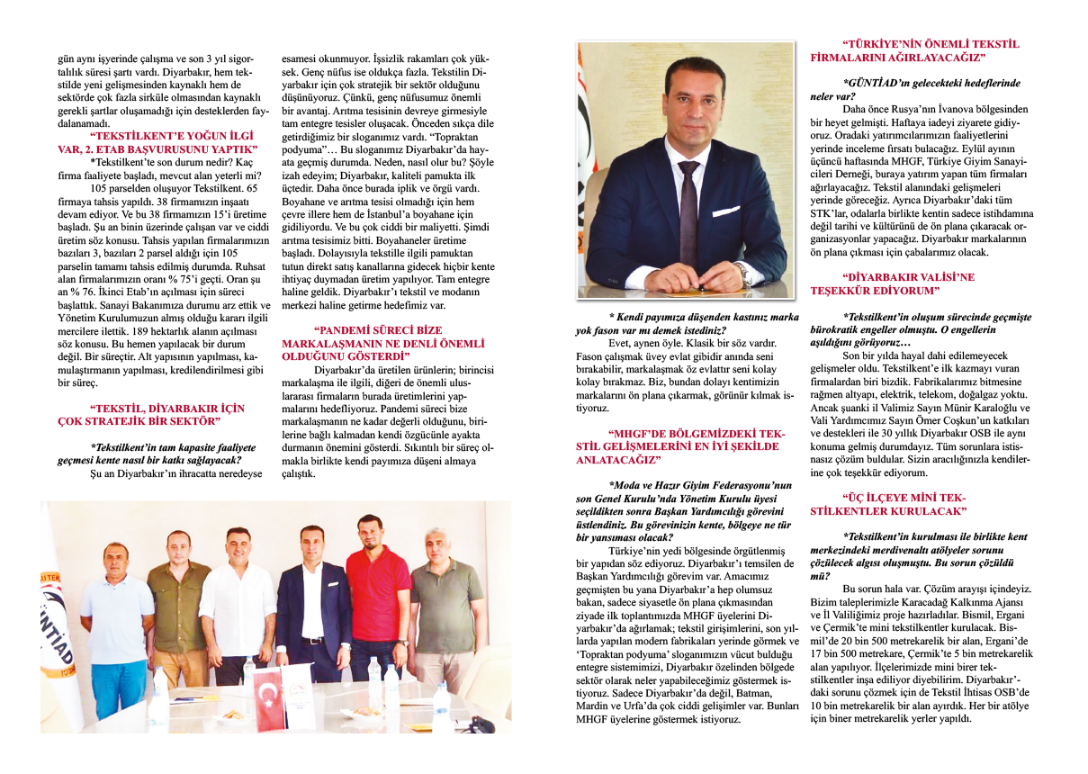 Göreve geldikten sonra dünya Covid pandemisiyle karşı karşıya kaldı. Amacımız küçük ile büyüğü bir araya getirebilmek, Diyarbakır’da tekstil sektörümüzü ve GÜNTİAD’ı görünür kılmak, Diyarbakır’daki kurumlar içerisinde hatırı sayılır bir noktaya getirebilmekti. Ancak demin de dediğim gibi Covid’den tün dünya ve bütün sektörler etkilendi. Sektörel olarak da pandemiden en çok etkilenen bizler olduk. Emek yoğunluğu isteyen bir sektör olmamızdan kaynaklı çok sayıda personel çalışıyor ve her yer kapanmasına rağmen bunların ödemesini yapmak durumunda kaldı. Devletin Kısa Çalışma Ödeneği gibi programları olmasına rağmen bölge olarak çok az faydalandık.